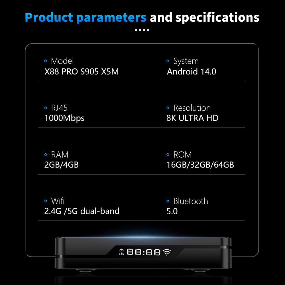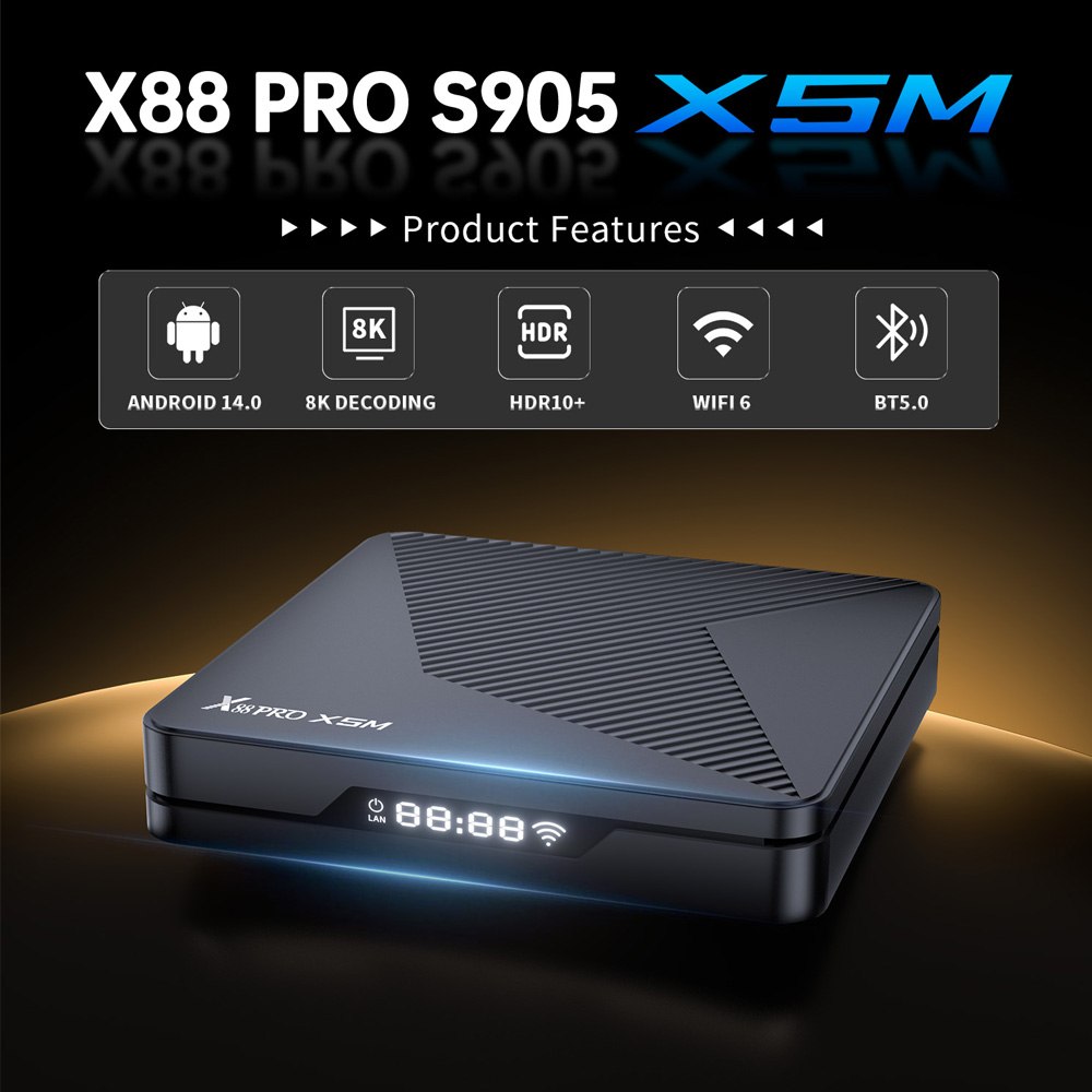 با عرضه اندروید باکس X88 PRO S905 X5M جدید در فروشگاه اینترنتی اندروید باکس خاورمیانه لازم دانستیم بطور اجمال به بررسی ویژگی های برجسته سخت افزاری آن بپردازیم در این محصول از پردازنده مرکزی جدید و قدرتمند Amlogic S905X5M SoC با فناوری ۶ نانومتری استفاده شده پردازندهای که ظاهراً ۲۱٪ سریعتر از مدل قبلی خود (۳۰ هزار DMIPS) یعنی Amlogic S905X4 (۲۰ هزار DMIPS) است به همراه یک پردازنده گرافیکی جدید Mali-G310 V2 نیز داریم که قدرت گرافیکی آن را دو برابر میکند. در ضمن باید به استفاده از پورت شبکه گیگابیت و وای فای 6 آن نیز اشاره کرد.سیستم عامل اندروید ۱۴ است و در تئوری الگوریتمهای Ai-SR آن فعال خواهند بود که کیفیت پخش ویدیوهای با وضوح پایین را بهبود میبخشد.
